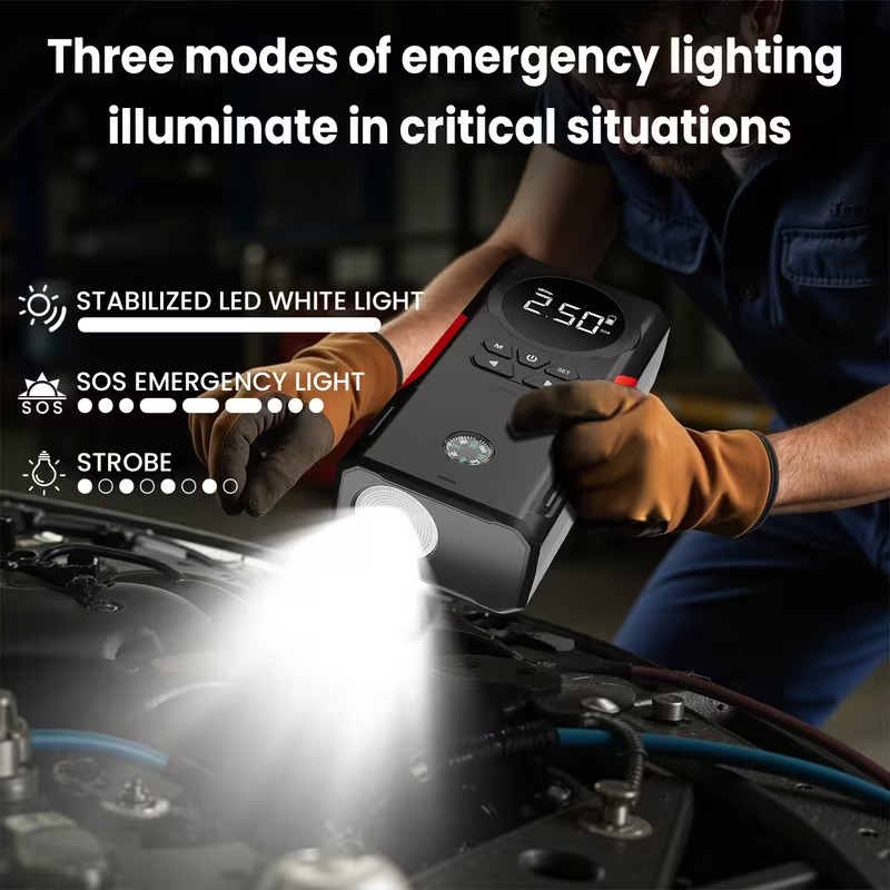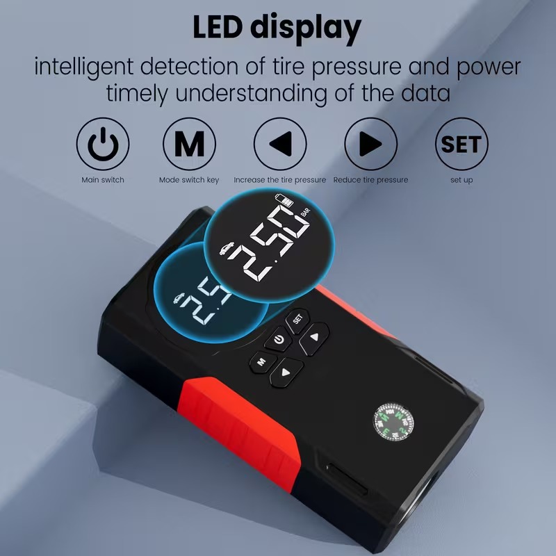 12000mah portable car jump starter with air compressor tire inflator smart portable power bank 3 led light suitable for all car emergency with led display black details 3