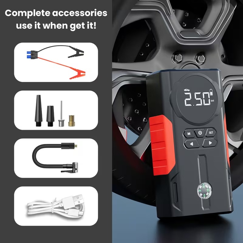 Be the first to review “12000mAh Portable Car Jump Starter with Air Compressor, Tire Inflator, Smart Pressure Setting, Portable Power Bank, 3 Modes LED Light, Suitable for All Car Emergency Starts, with LED Display, Black”