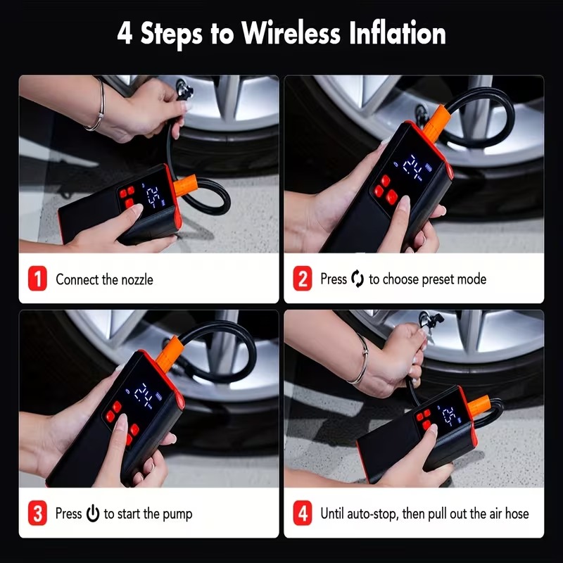 Easy to use: First, choose the appropriate nozzle; second, press the button to select different modes, or you can manually set the tire pressure value from 1 to 150 PSI; third, press the start button to begin inflation; fourth, just wait a few minutes until the device automatically stops inflating, then remove the nozzle, and your inflation is complete.