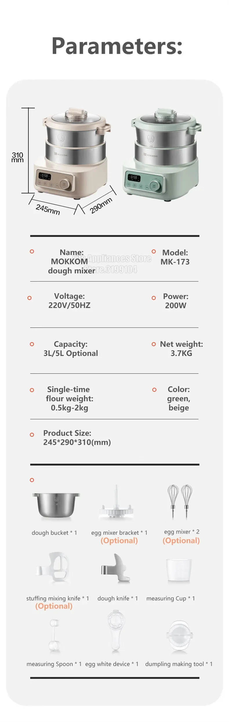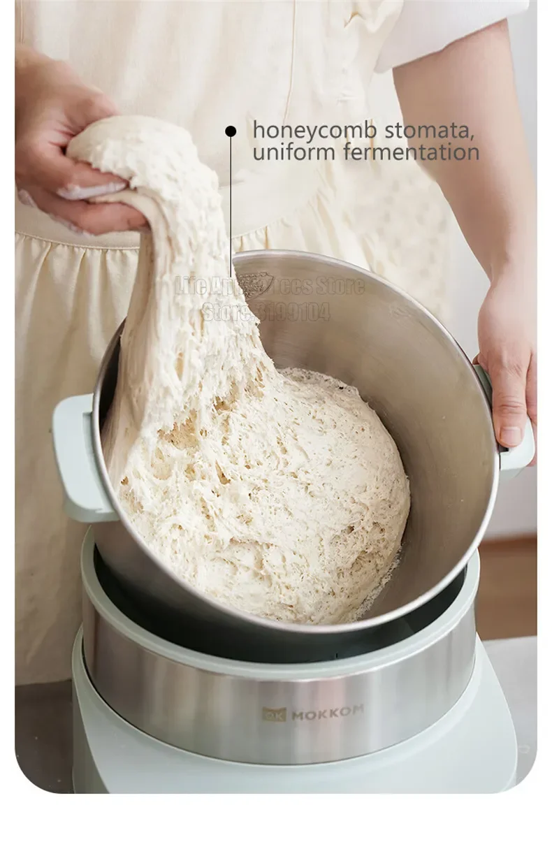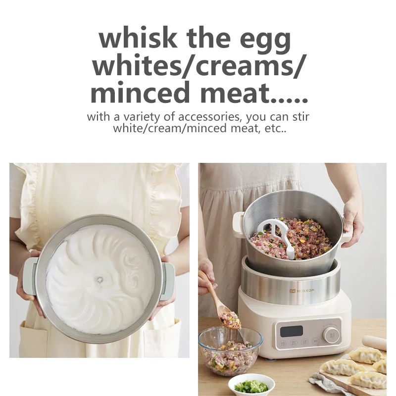 ●Mokkom multi-function dough machine, 3L/5L capacity optional, can put 0.5KG-2KG flour at a time, can be used to make dough, fermentation, convenient for you to make steamed buns, noodles, bread, pizza and other pasta, fully automatic, no need to supervise, 15 minutes to make smooth dough, with stirring accessories, can be stirred cream, egg white, minced meat, vegetable trap, etc., is your kitchen helper;