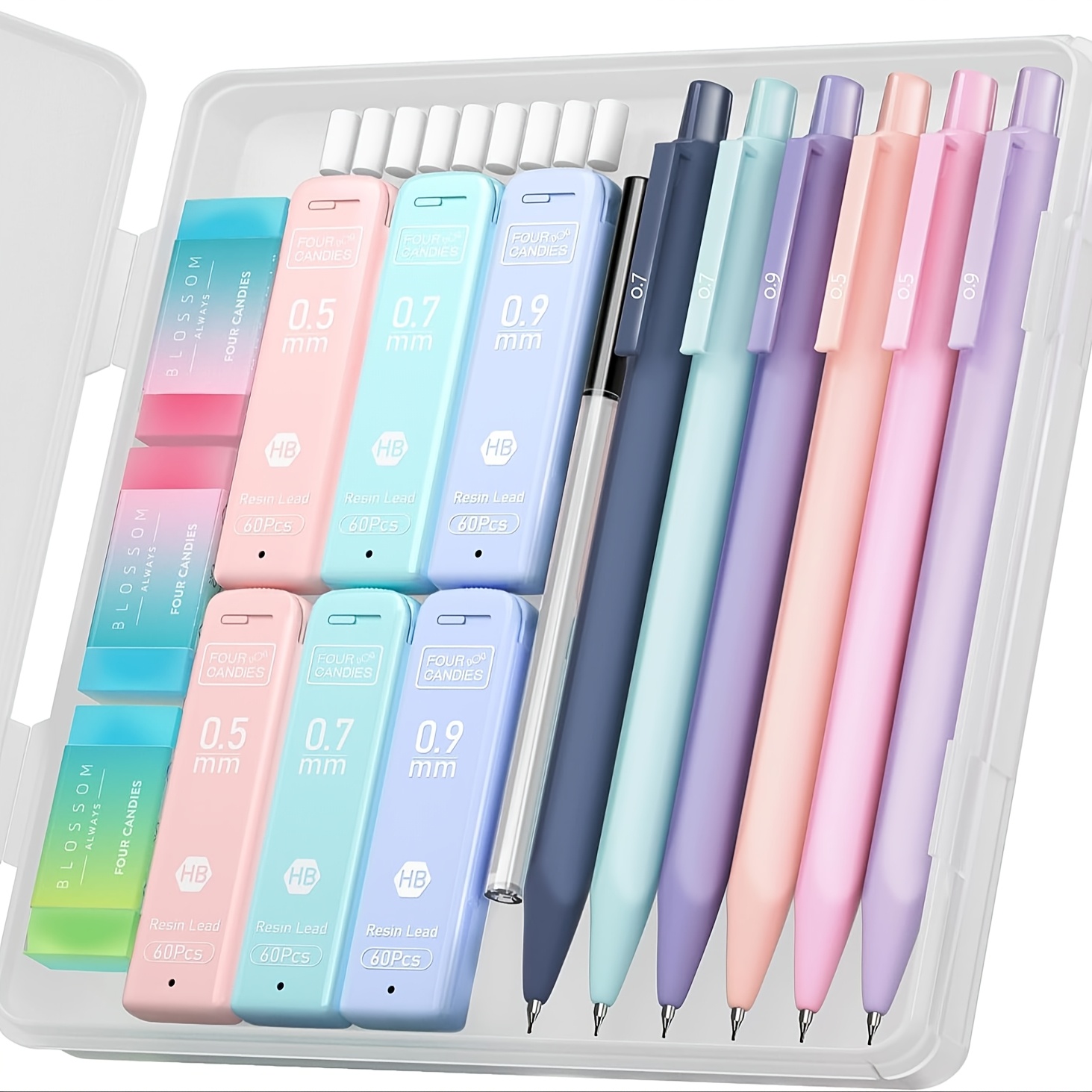 [6pcs Mechanical Pencils Set] 6pcs Pastel Mechanical Pencils Set, 0.5mm, 0.7mm & 0.9mm | Four Candies Cute Mechanical Pencil | 360pcs Leads, 3pcs Erasers, 9pcs Eraser Refills, Aesthetic Pencils for Girls Writing, Art Drawing