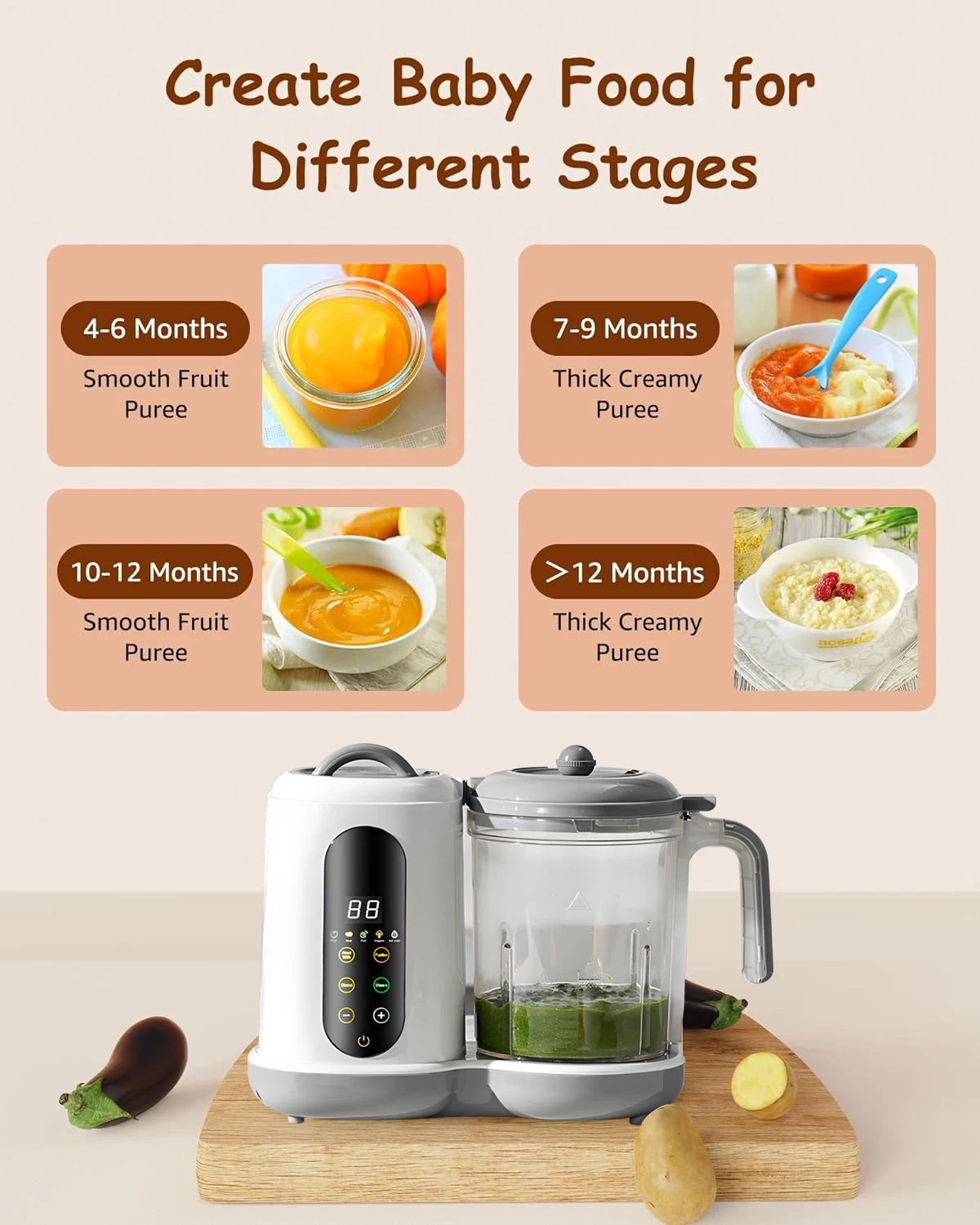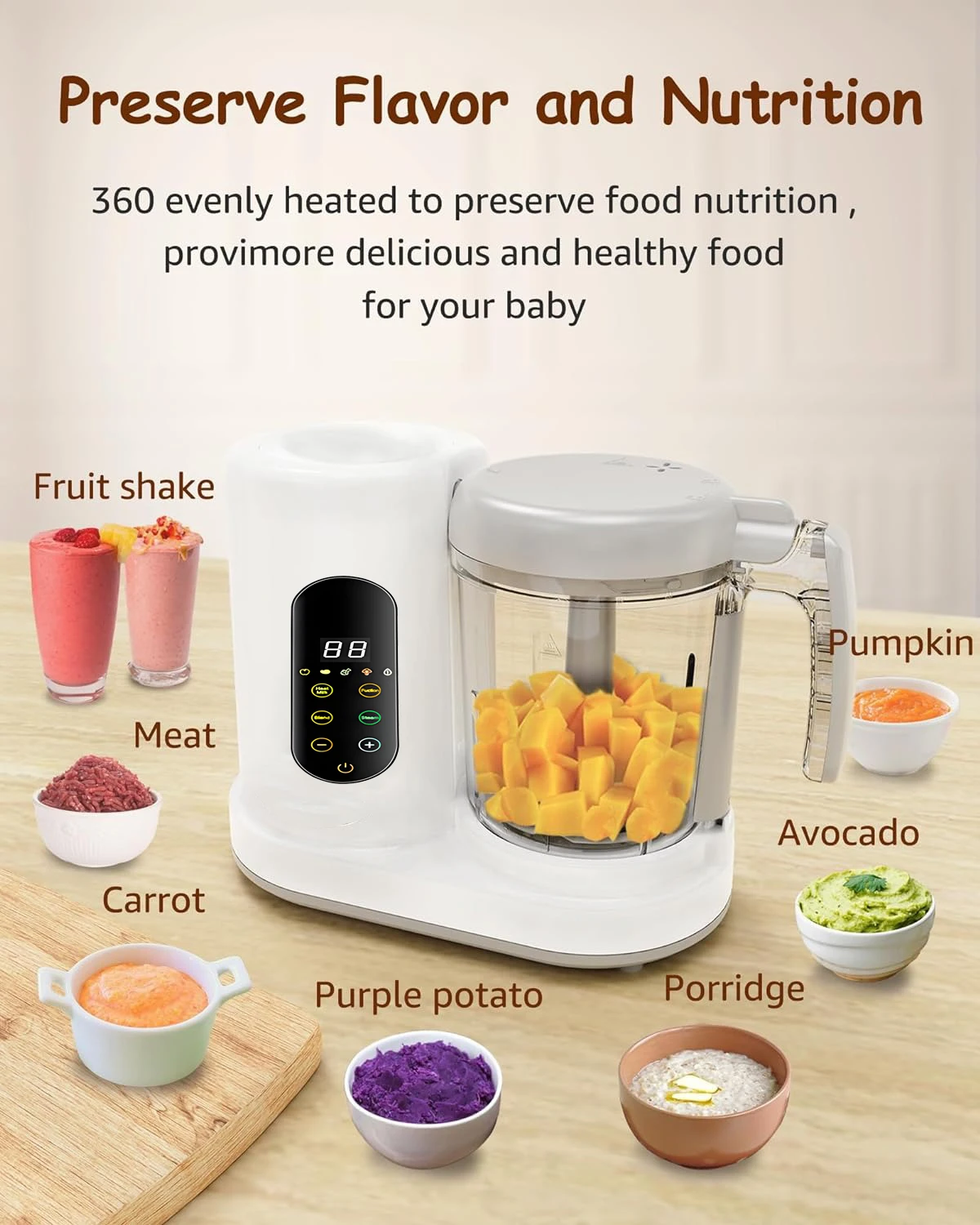 (4) The unique 360 degree circulation technology locks in nutrients, flavors and vitamins in the food, ensuring your baby benefits from tasty and healthy homemade food. Our baby food steamer and processor makes baby food in different consistencies to suit every feeding stage, providing your baby with natural nutrition of meat, fruit, and veggies.