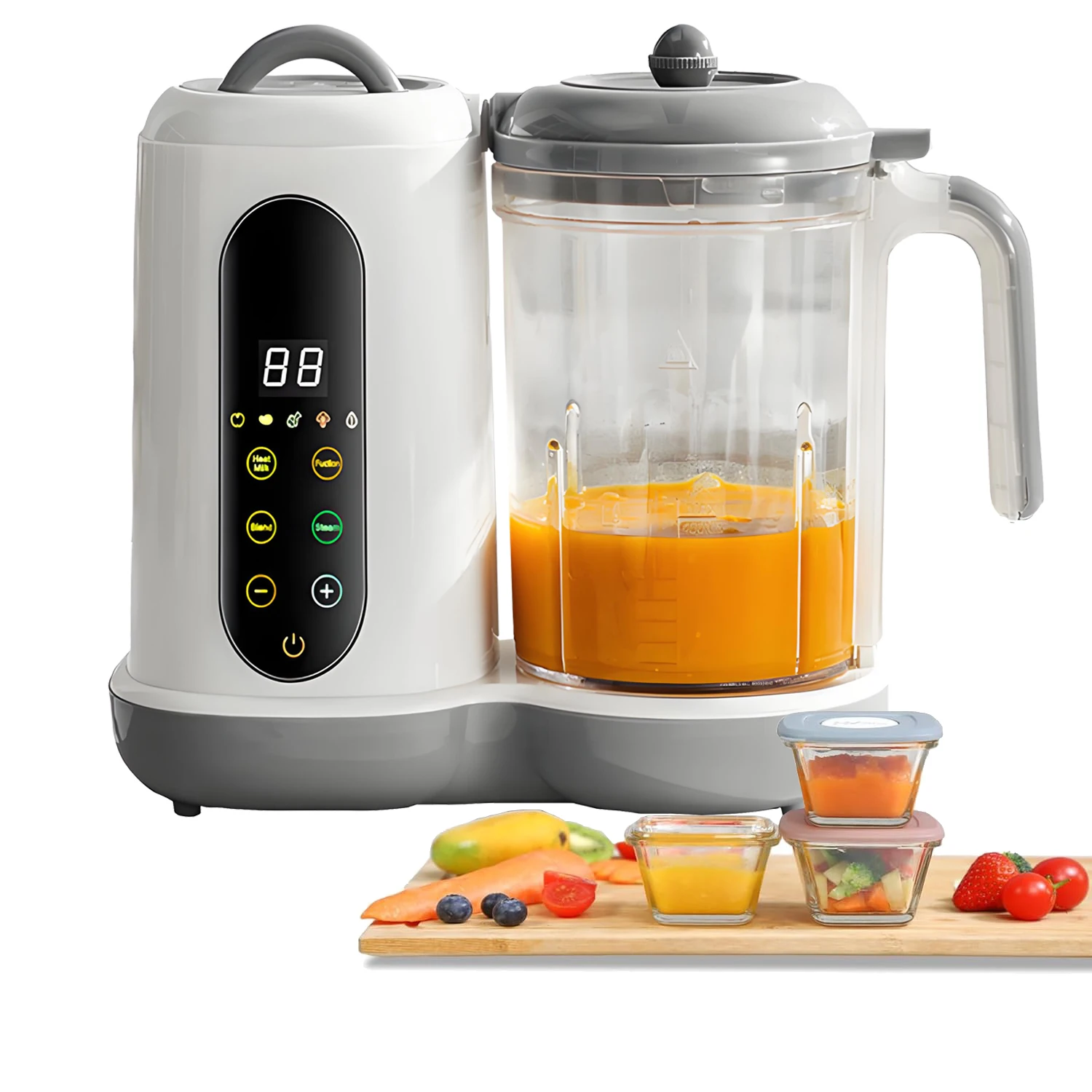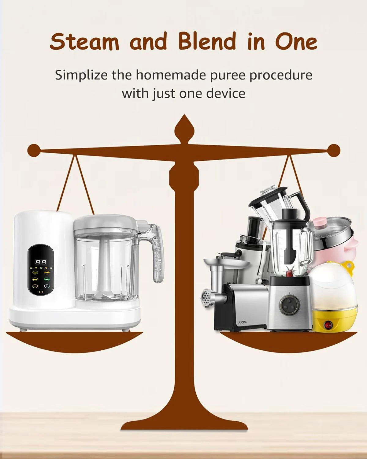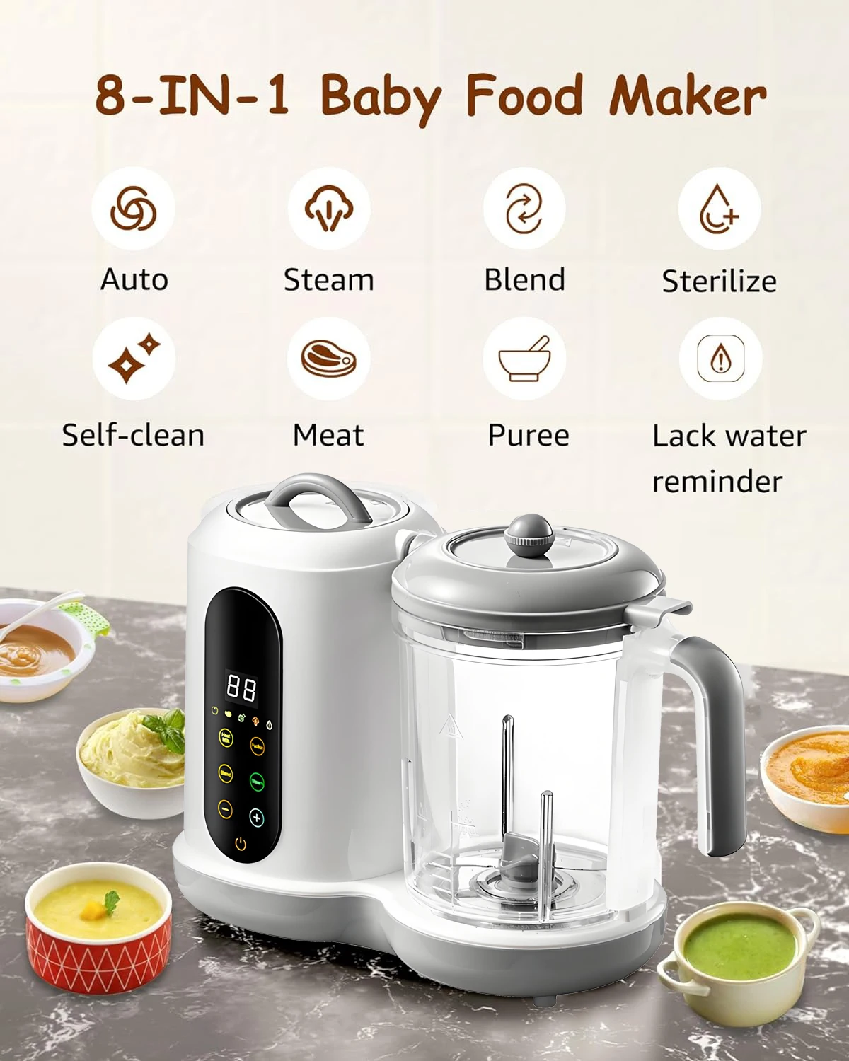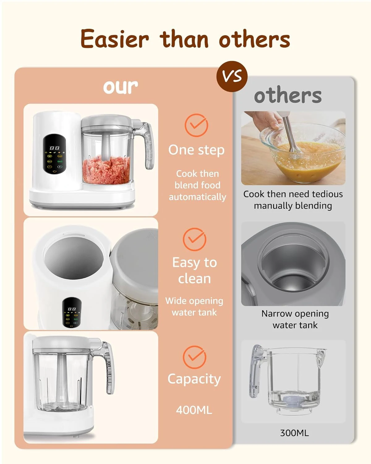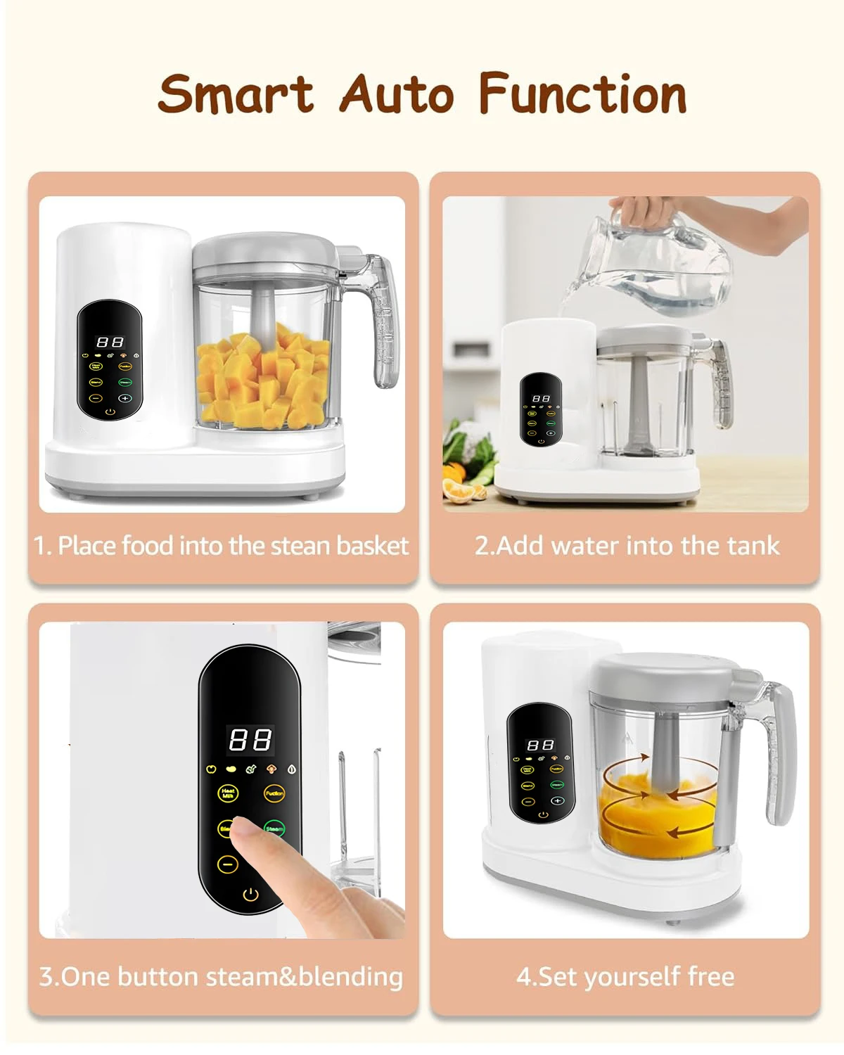(2) One press of the automatic button and the baby food blender does the steaming and blending for you, eliminating tedious and redundant steps. No steaming on the stove, No dirty pots, pans, and blender, No hassle. Most parts are dishwasher safe too!