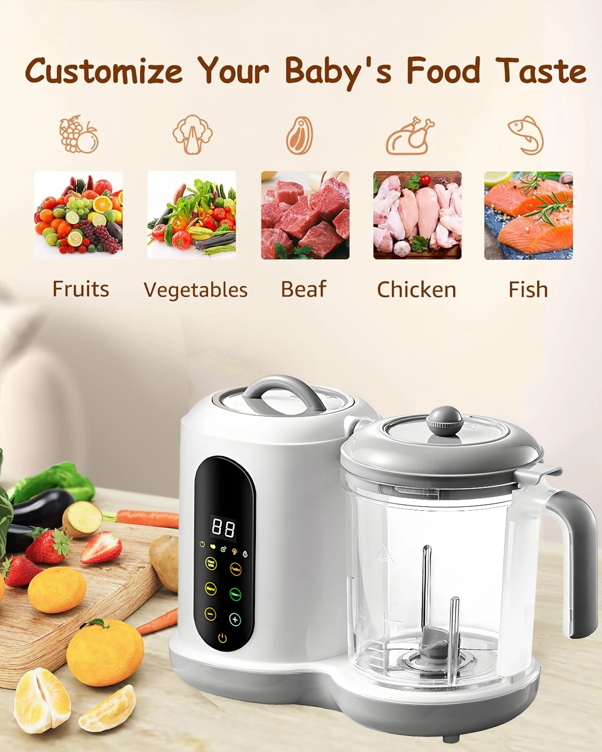 (3) Baby food steamer and blender with smart digital control makes your settings clear and quick, you can choose auto mixing or manual mixing modes for your preference, precisely control the consistency, meet your baby’s needs for different food tastes, making everything so smooth and enjoyable. Plus, you can use it for the entire family, making juice, steamed veggie, etc.