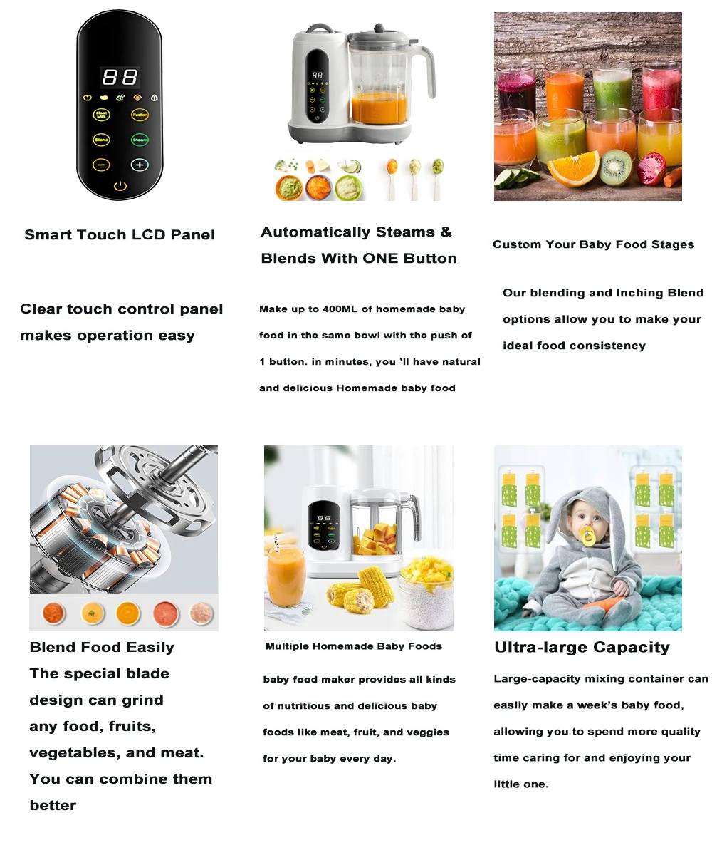 (5) The Food container of this baby food puree maker is made of baby food grade PP material and the blades is made of 304 stainless steel, which is BPA-free and healthy for baby’s growth. 400ML Large-capacity mixing containers can easily make a week’s baby food. High-quality precision 3 blades to help you easily complete mixing. The water shortage function alerts you when the baby steamer is running out of water. Great gifts for Baby Showers.
