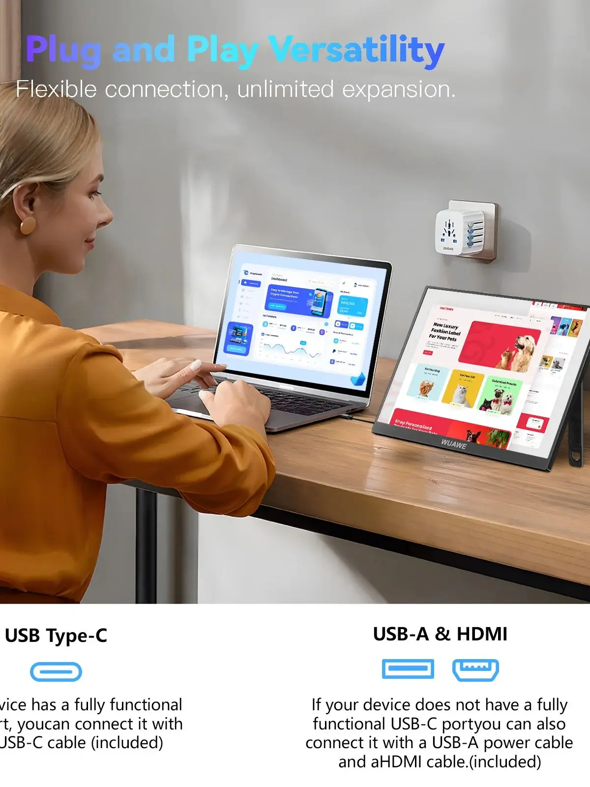 • Plug and Play External Monitor: WUAWE portable screen just got even more convenient with plug-and-play functionality. Simply connect to power and display signal transmission using a USB Type-C cable – no drivers needed. With 2 full-featured Type-C ports and a mini HDMI port, easily connect to your laptop, PC, cell phone, Mac, PS5/PS4, Xbox, and Switch for seamless connectivity on-the-go. (Note: Thunderbolt 3.0 or USB 3.1 Type C DP ALT-MODE required for compatibility)