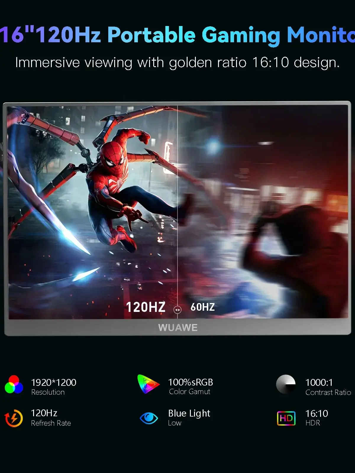 Christmas Gifts 16″ 1200P 120Hz Portable Monitor, 16:10 100% sRGB Portable Gaming Monitor with Built-in Stand,HDR and Freensync,