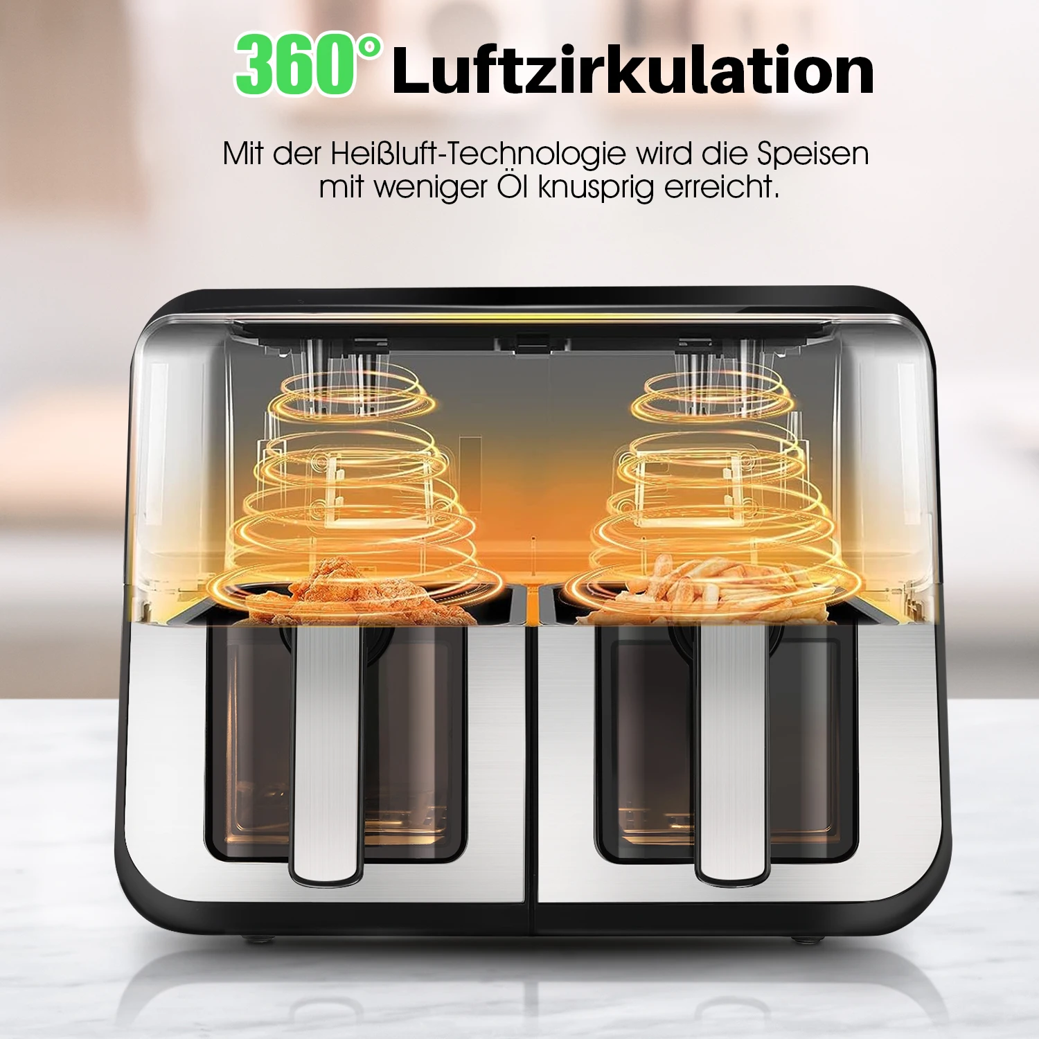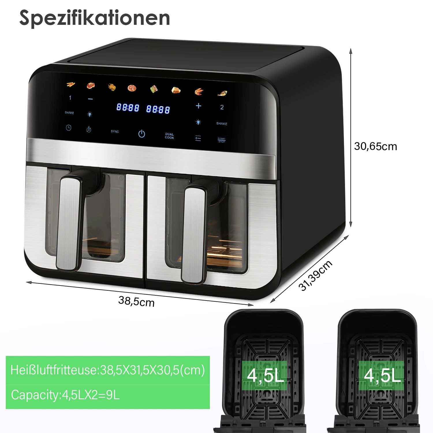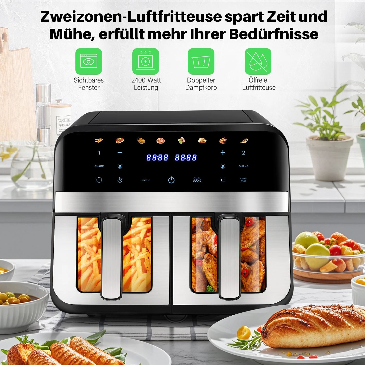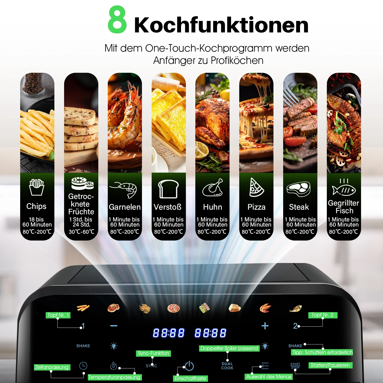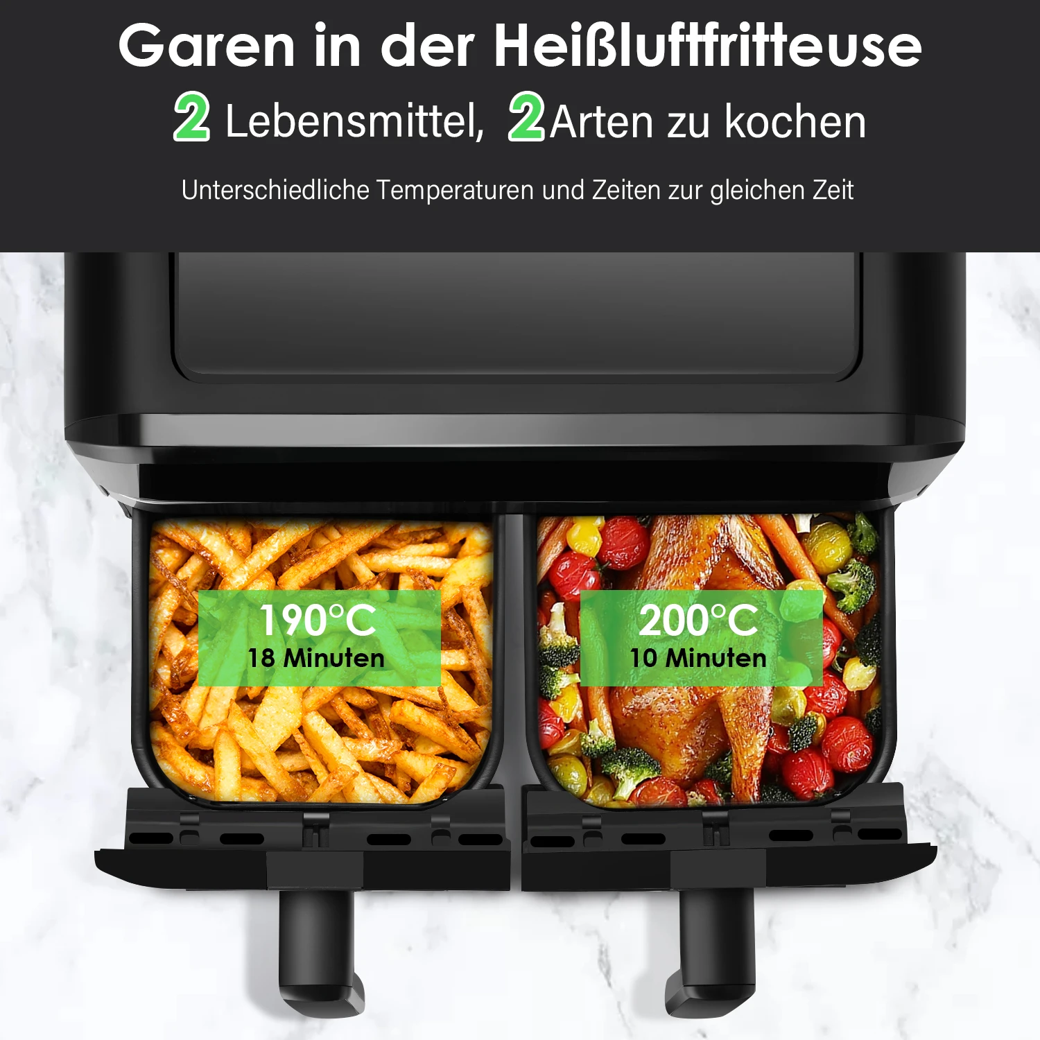 The XL air fryer with 2 independent cooking baskets supports simultaneous dual-zone cooking, saying goodbye to the cumbersome operation of traditional single-basket models that require cooking in turns, and easily achieving the simultaneous completion of two dishes with one machine.