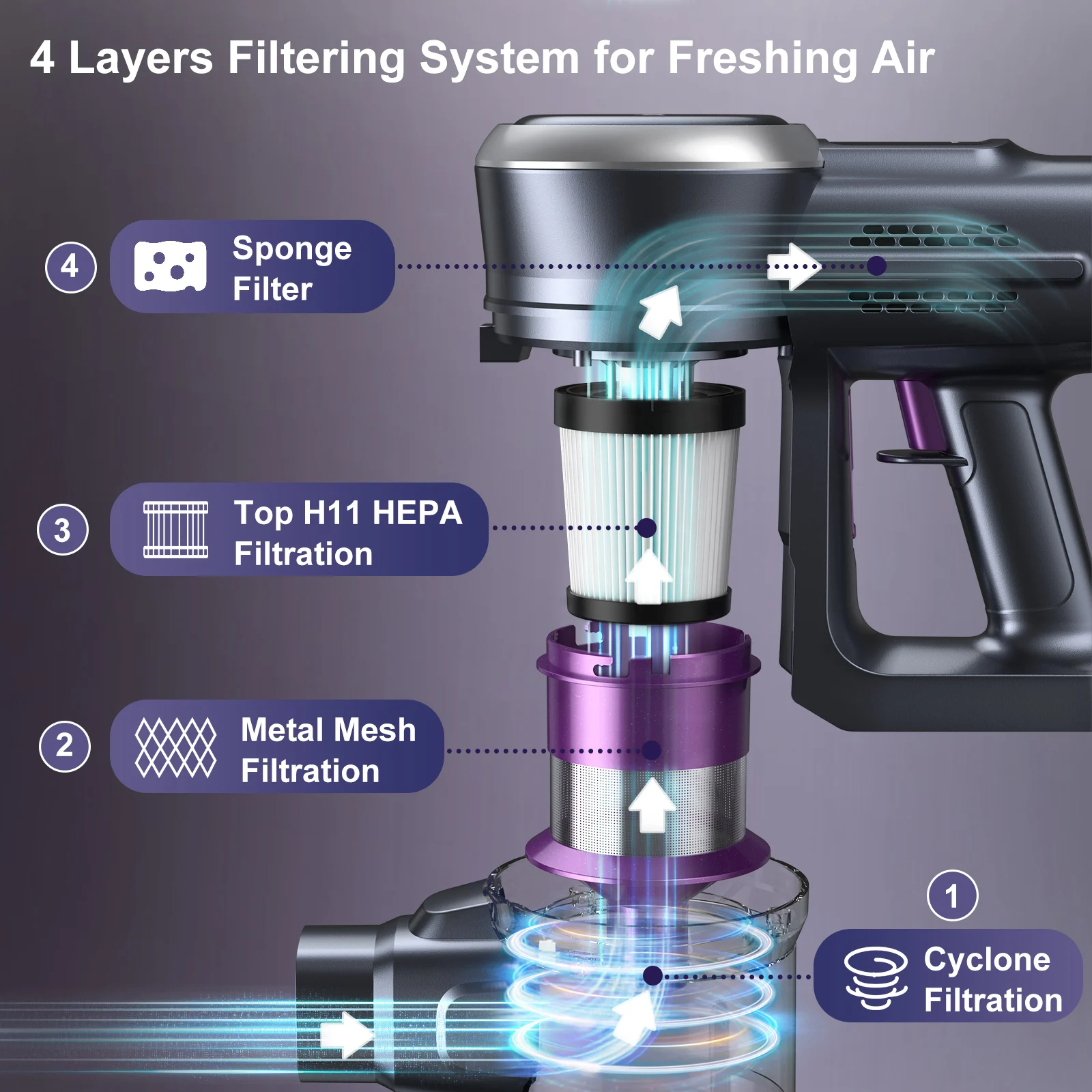[A cutting-edge 4-layer filtration system is employed to purify the air] By utilizing a top-tier HEPA filter rated at H11, this cordless stick vacuum cleaner can effectively trap 99.99% of dust particles as tiny as 0.3 microns, providing you with fresher and healthier air.Innovative Roller Brush Design for Easy Cleaning