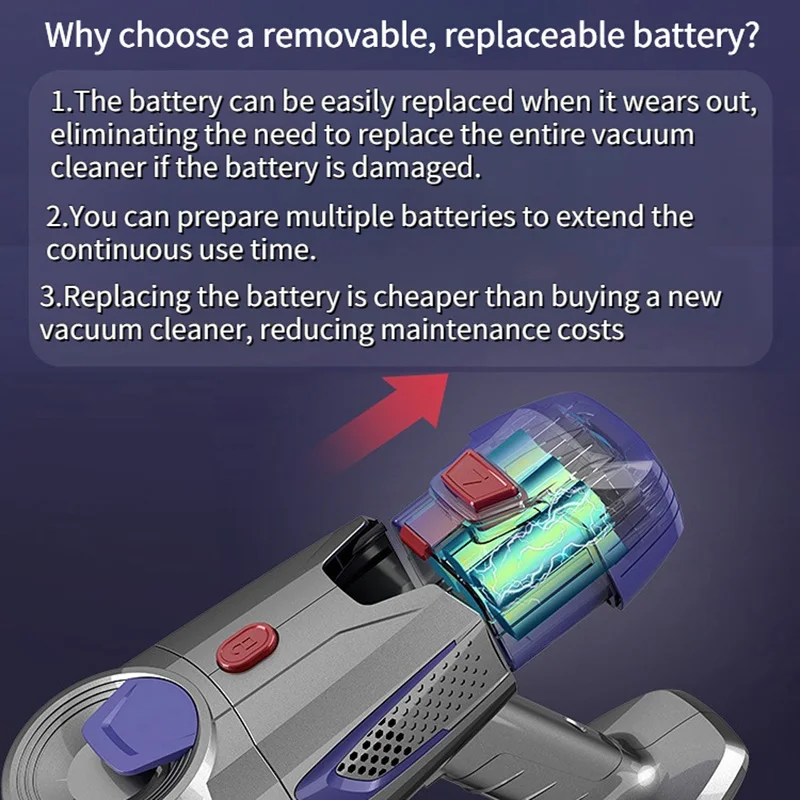 Detachable and Replaceable Battery: The battery can be easily replaced when damaged or aged, eliminating the need to replace the entire vacuum cleaner. This feature saves costs and is more environmentally friendly.