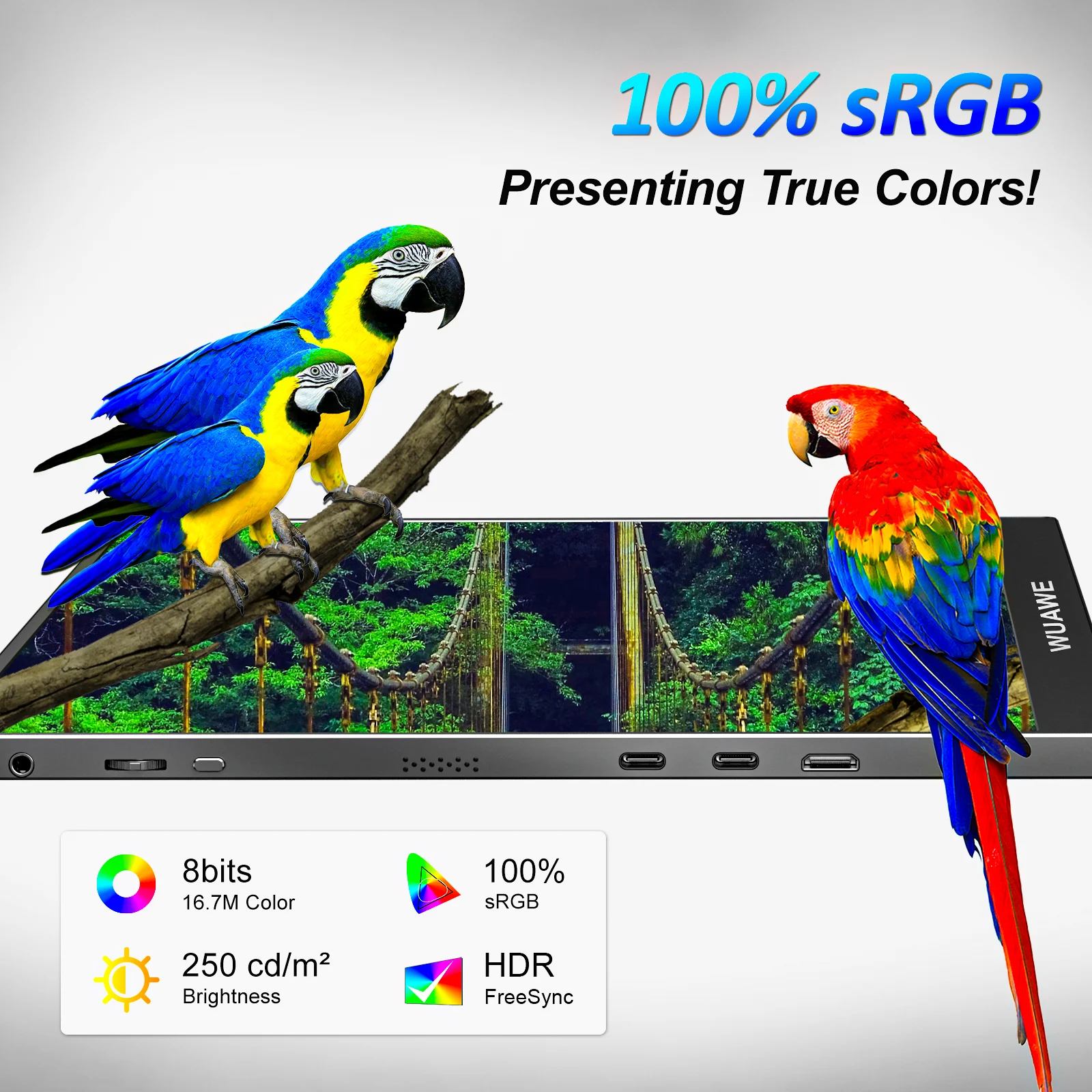 • 🌈 Plug and Play External Monitor: WUAWE portable laptop monitor just got even more convenient with plug-and-play functionality. Simply connect to power and display signal transmission using a USB Type-C cable – no drivers needed. With 2 full-featured Type-C ports and a mini HDMI port, easily connect to your laptop💻, PC🖥️, cell phone📱, Macbook, PS5/PS4🎮, Xbox, and Switch for seamless connectivity on-the-go. (⚡Note: Thunderbolt 3.0 or USB 3.1 Type C DP ALT-MODE required for compatibility)